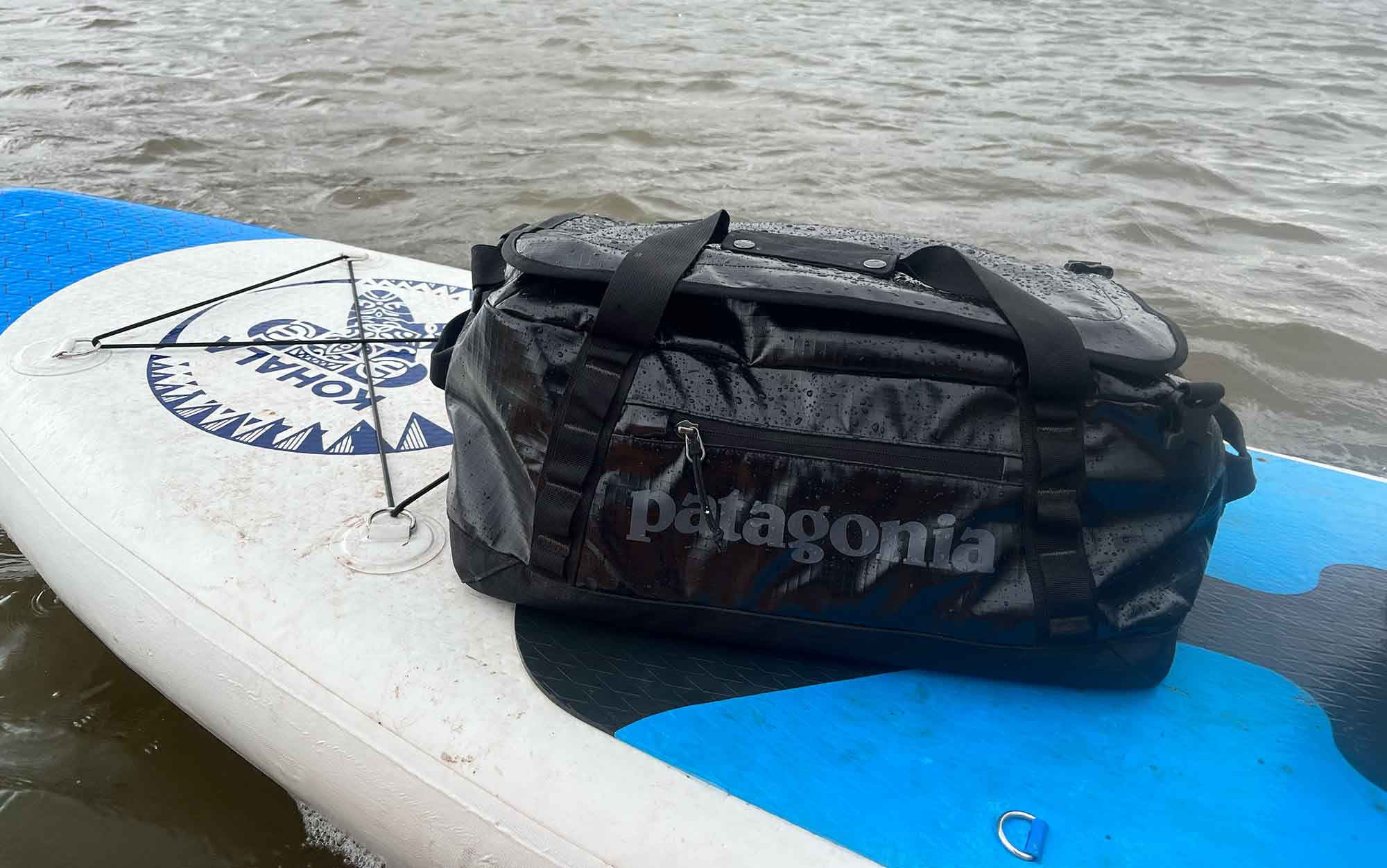 Patagonia’s Black Hole duffel is a weather resistant backpack that can also be carried by reinforced haul handles or the handheld loops on the top and bottom. The cavernous main compartment and wide opening give easy access to all of your items. There is also a mesh pocket on the underside of the opening and another large pocket that is accessible from an outer and inner zipper. The duffel is sold folded into this large pocket and you can re-pack it (I had to watch a video; it is a tight and specific fold) into the 10 x 7-inch pouch for storage.