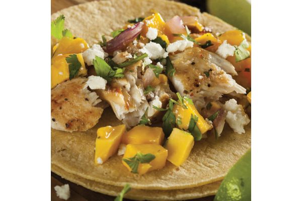 - Assemble tacos with fish, mango mixture, drizzle of spicy ranch, crumbled cheese, and lime wedges. Serve immediately.