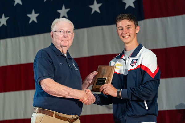 The juniors continue to have an impressive showing at the National Pistol Matches. Ellie Arkin, 17 of Falls Church, VA shoots with the NoVa Sharpshooters won the G.P. Perry Defino Trophy for the second year in a row! He scored a 283-7X which was 7 points ahead of second place in the match. Arkin also won the Riding the High Places Trophy with a 546-8X, along with his teammate, William Regala.