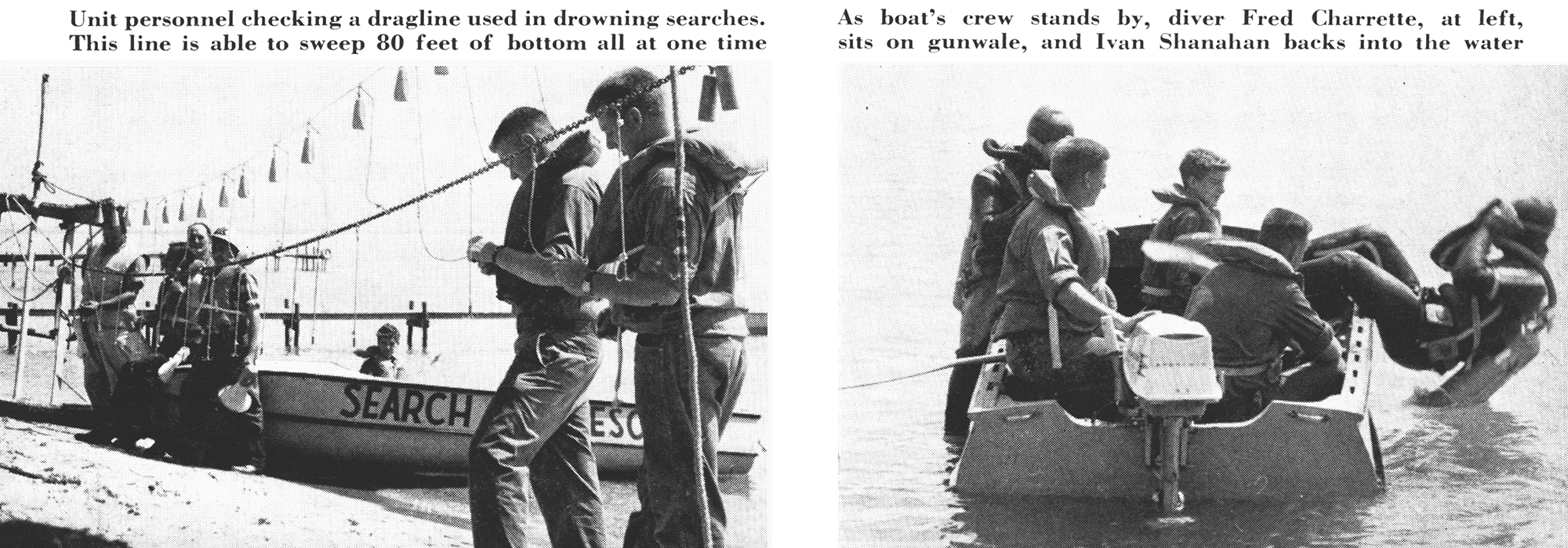 In addition to the unit’s own equip ment, members supply many major items when needed, including six light trucks and a jeep, all equipped with two-way radios; an additional 11 sets installed in cars; 40 boats, motors, and trailers; canoes, and walkie-talkies. The divers furnish their own suits, air tanks, masks, and other gear. All trucks are equipped for cooking and sleeping and can serve as mobile field bases.