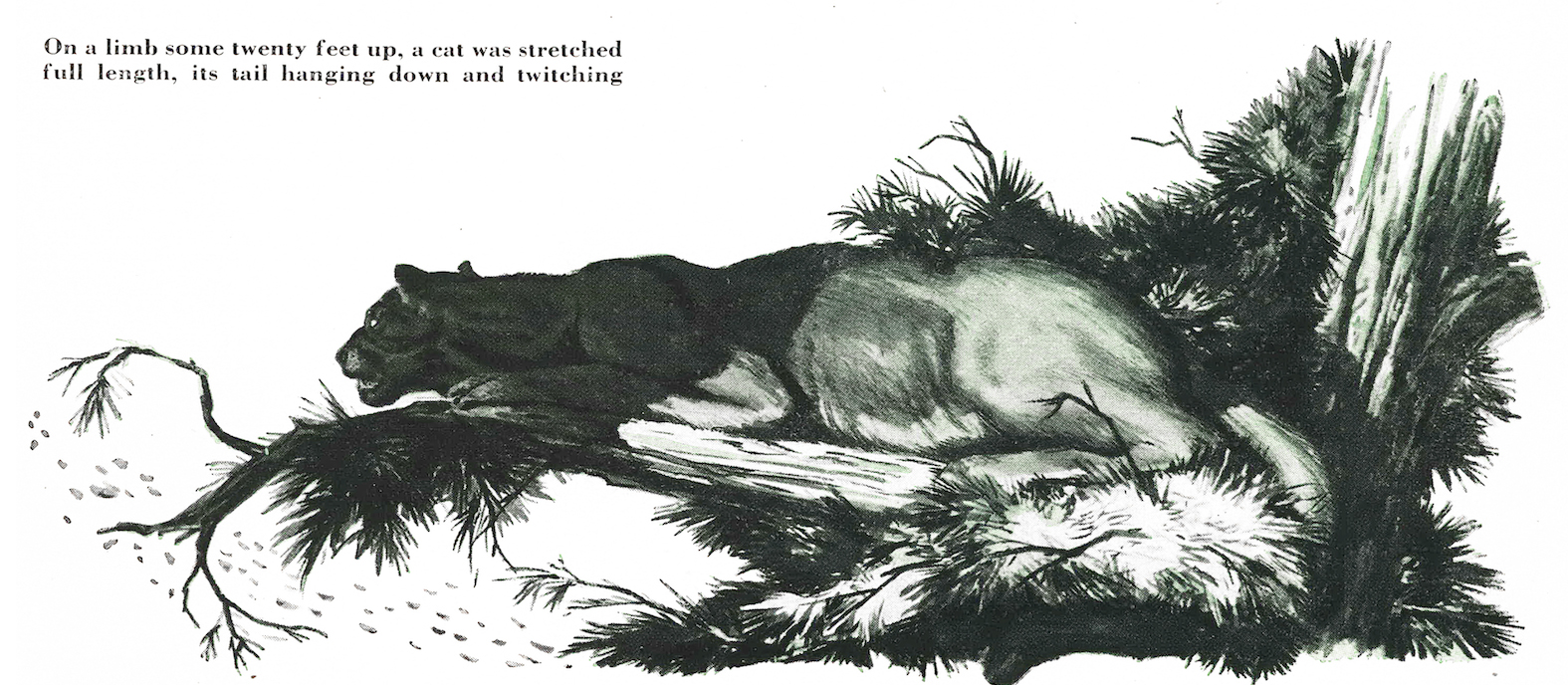 As I yelled, Maggie came up through the trees on one of her mysterious rounds. She circled the bole of the big pine where the cougar lay hidden. She looked up once at the foliage which concealed the cat. Yelping in a satisfied manner, she then started off again down the trail which she had beaten through the snow.