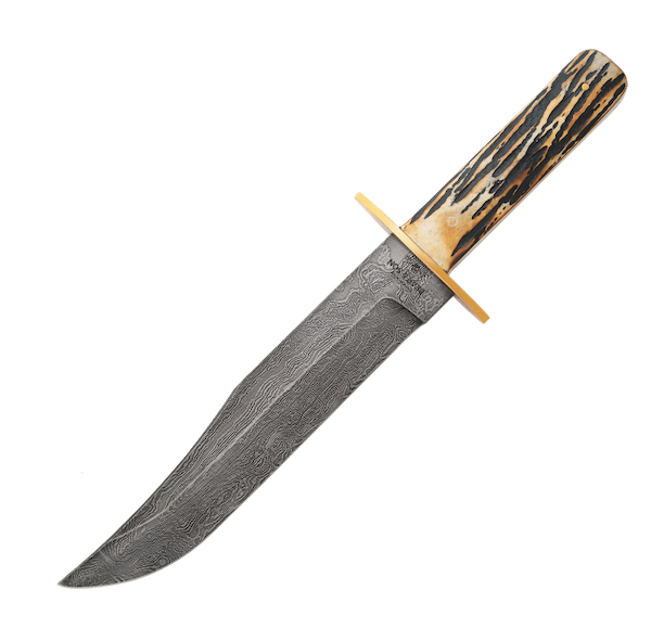 Shy of 15 inches in total length, the knife is a true Bowie, and the 9-inch Damascus blade married with the India Stag Bone handle makes it a stunner. The brass guard is beefy and prevents the hand from slipping down on the 58-60 Rockwell blade.