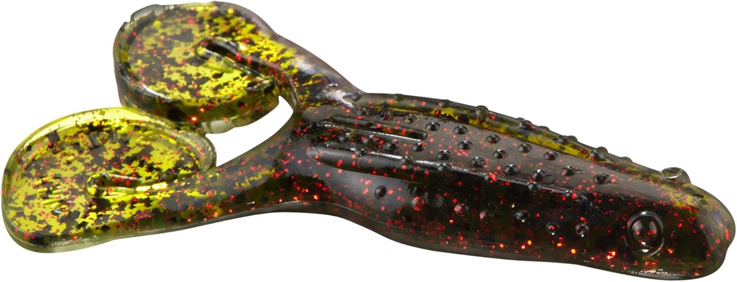If you want a chaos-creating, loud-slapping, big-bite-inducing toad, the Strike King Rage Tail Toad is your pick. This is the loudest toad I’ve ever fished, which is due to the large legs. Although these legs lie flat on the water, they incorporate the Rage Tail design element that many Strike King soft plastics are known for. There are two small flanges on each leg, one on the bottom and one on the top. These flanges catch water and send the legs kicking and flapping, creating all sorts of noise. When bass are in a foul and malicious mood, this toad can generate ornery and aggressive strikes. It is especially effective when fishing through sparse to relatively dense cover, like lily pad fields. You’ll want the pads to be far enough apart that you can keep your bait in the water and moving most of the time so it can generate noise and action. That noise is enough to pull fish from long distances, and it does this far better than any other frog can.