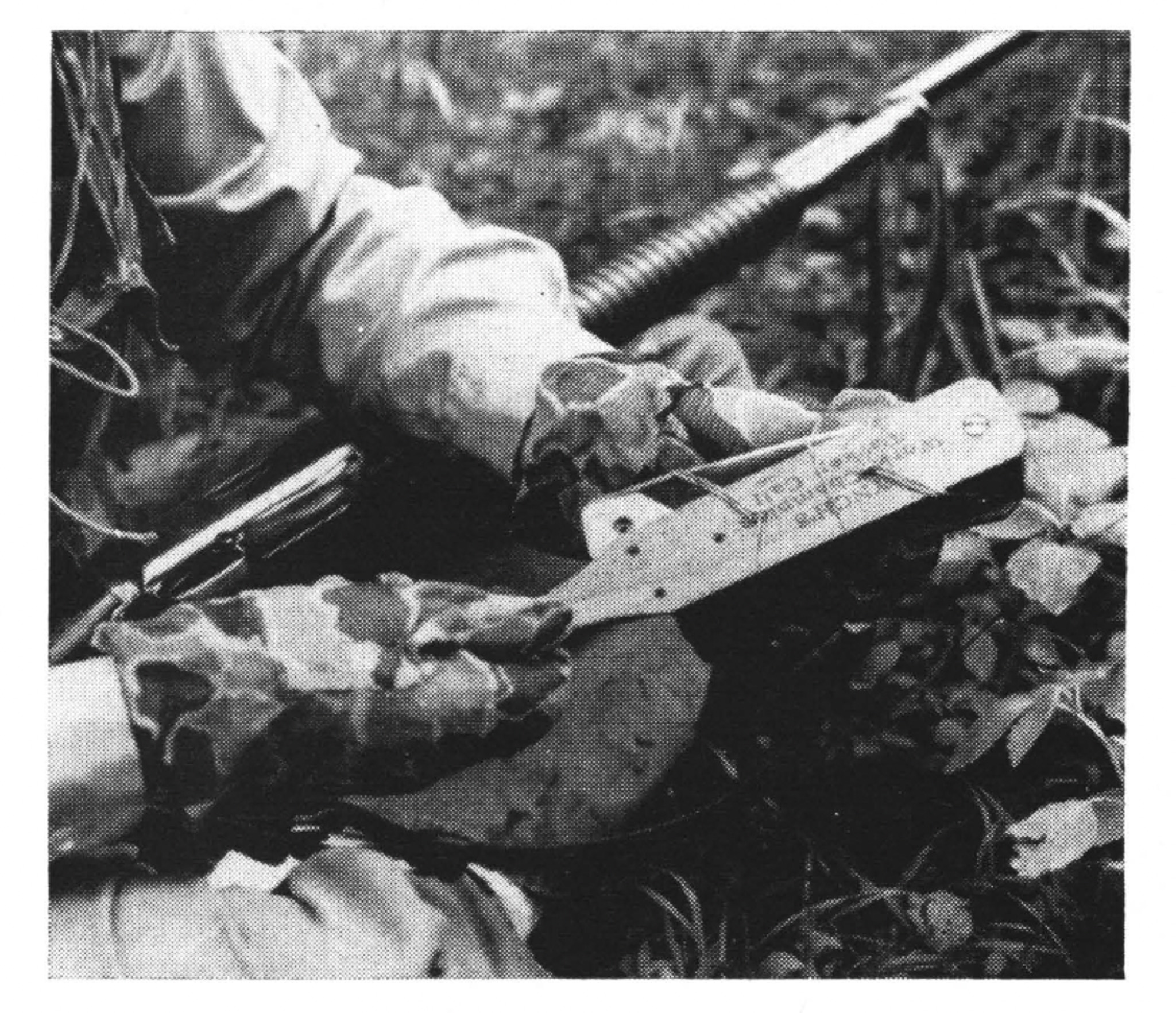 That first morning I almost had a chance at a gobbler. Bob Card and I heard him gobble across a creek valley, and I went after him. The trick is to get close to a gobbling bird without letting him see you. Then find a natural blind of logs or brush, or make one by surrounding yourself with leafy limbs stuck around a tree trunk, which you can lean against so you won’t be silhouetted against an open background.