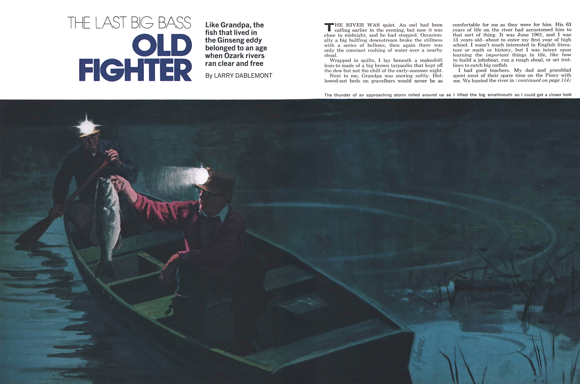 My father was one of the many fishermen who had hooked and lost this big bass. Dad and I floated the river often, trying to catch big smallmouths on lures. I had seen Dad catch big bronzebacks on artificial lures, andfishing the Big Piney by myself — I had caught several two-to-three-pounders on minnows and nightcrawlers. But never had I dreamed of catching a fish like Old Fighter.