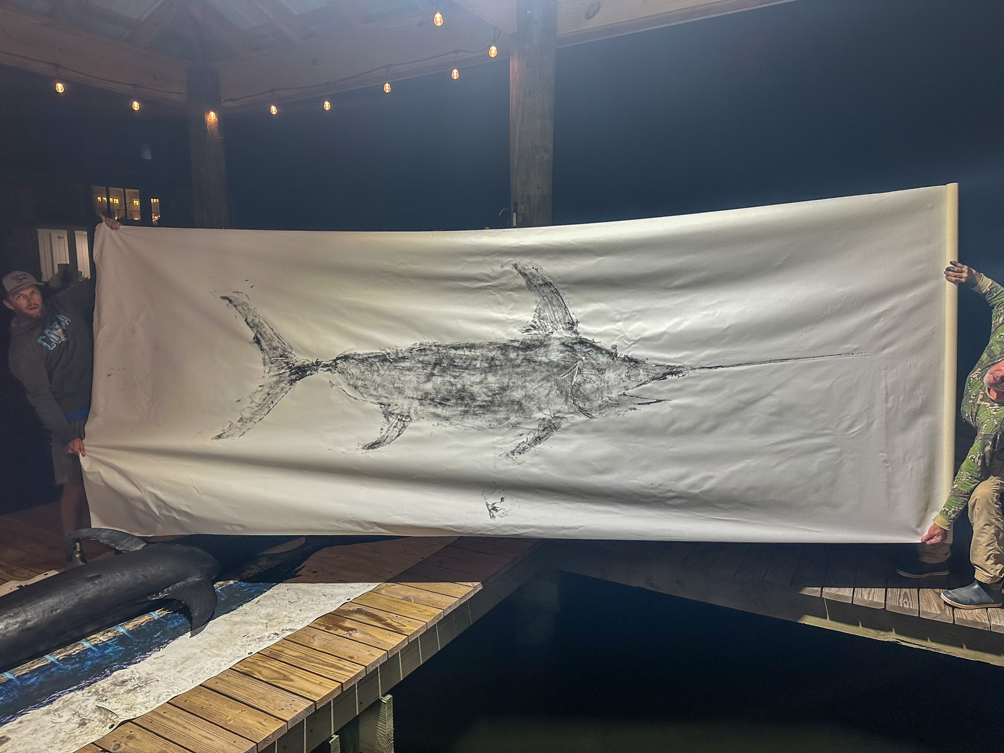 Alexander and his crew believe that their billfish could have been a contender for the state record right out of the water, but without a certified weight, they’ll never know. He had the swordfish inked on a cloth in the traditional Gyotaku method.