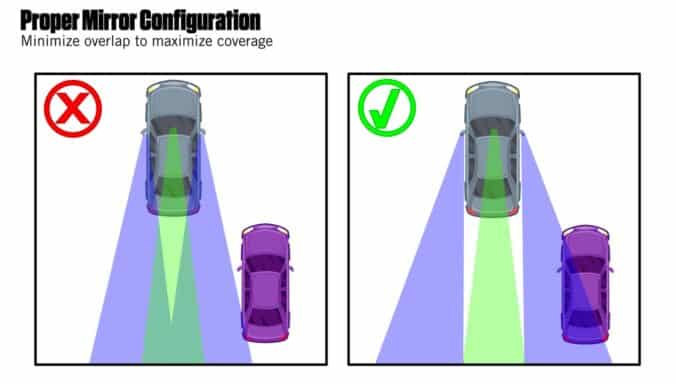 - Adjust your mirrors to maximize coverage with as little overlap as possible. While all senses are important, vision is our strongest asset so don’t shortchange yourself.