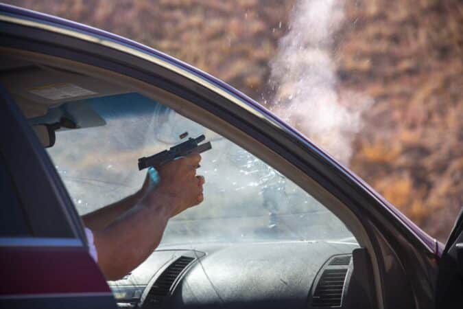 On the second day of the course, we put some time in on the range. This isn’t a shooting course, but guns are absolutely involved. What is and isn’t bulletproof on a car depends greatly on chance and the caliber, but generally speaking your doors don’t count. Your engine block? Yes. Here we fired through different components and also through windshields both from inside-out and outside-in.